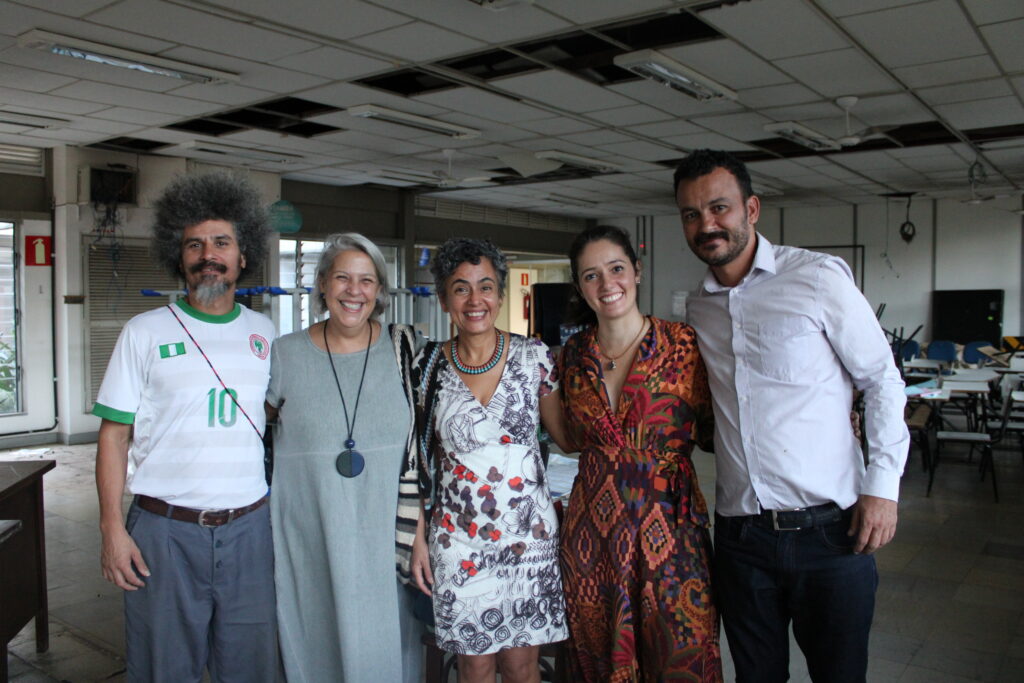 Diretoras da FaE, Andrea Moreno e Vanessa Ferraz, com o artista Paulo Nazareth e seu produtor Julio Nazareth e a professora Daniele Alves na ocupação artística da biblioteca da FaE. (novembro de 2023).