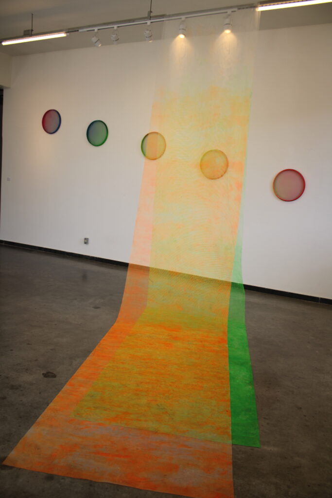 Na exposição destacaram-se duas longas telas fachadeiras pintadas à mão como estímulo à percepção da luz e do espaço pelo público. O trabalho debateu a teoria das cores, provocando os sentidos com as somas das cores sobre suportes translúcidos, integrando pintura e arquitetura numa composição que se destacou pela leveza e elegância das formas na cor, que, sutilmente, interagiram com a mudança da luminosidade do ambiente e com a posição do espectador em relação às obras na galeria.