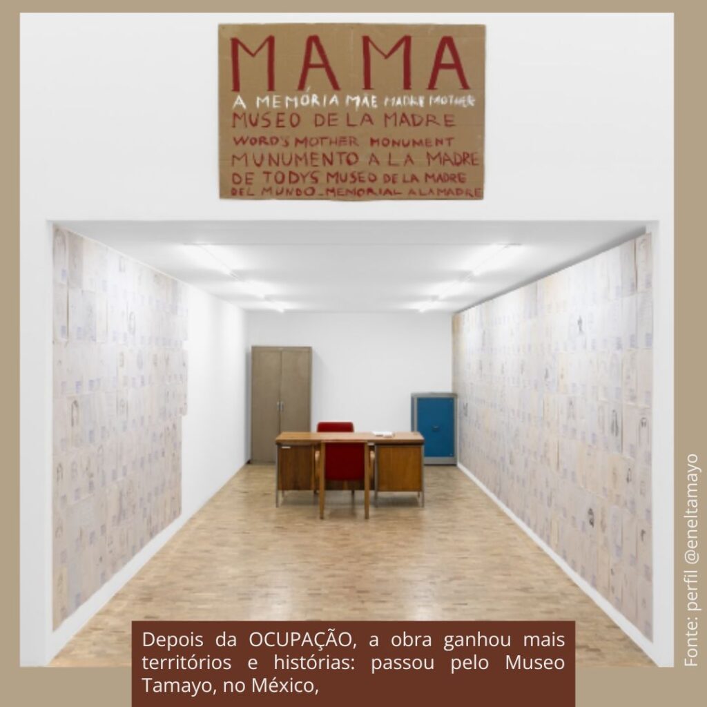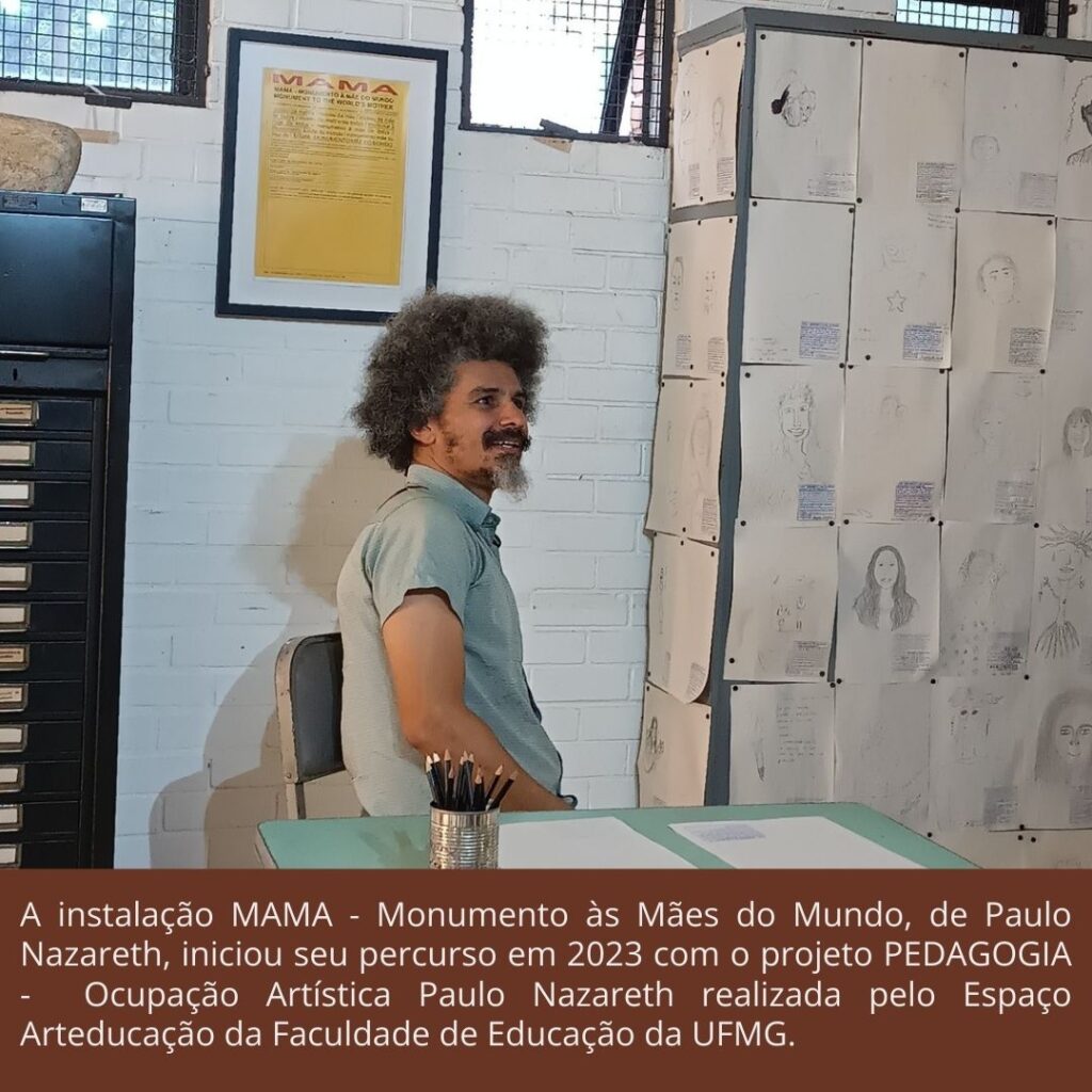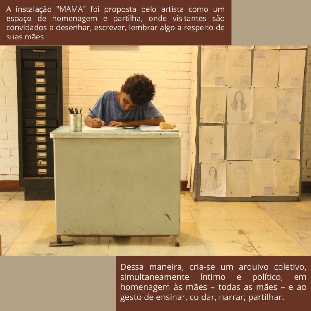Outro desdobramento da Ocupação, a instalação “MAMA – MONUMENTO À MÃE DO MUNDO”, ganhou mais territórios e histórias: depois de passar pelo Museo Tamayo, na Cidade do México, ela agora integra a exposição “Honey”, na Shiva Gallery, em Nova York. MAMA foi proposta pelo artista como um espaço de homenagem e partilha, onde visitantes são convidados a desenhar, escrever, lembrar algo a respeito de suas mães. Dessa maneira, cria-se um arquivo coletivo, simultaneamente íntimo e político, em homenagem às mães – todas as mães – e ao gesto de ensinar, cuidar, narrar, partilhar. Essa temática da maternidade e em especial da mãe do artista é revisitada em várias outras de suas obras ao longo de sua carreira artística. Em cada lugar por onde passa, a instalação MAMA – Monumento às mães do Mundo de Paulo Nazareth se transforma com novas intervenções e desenhos, reunindo novos gestos e afetos, que se acumulam como camadas de memória e reverência à figura materna.