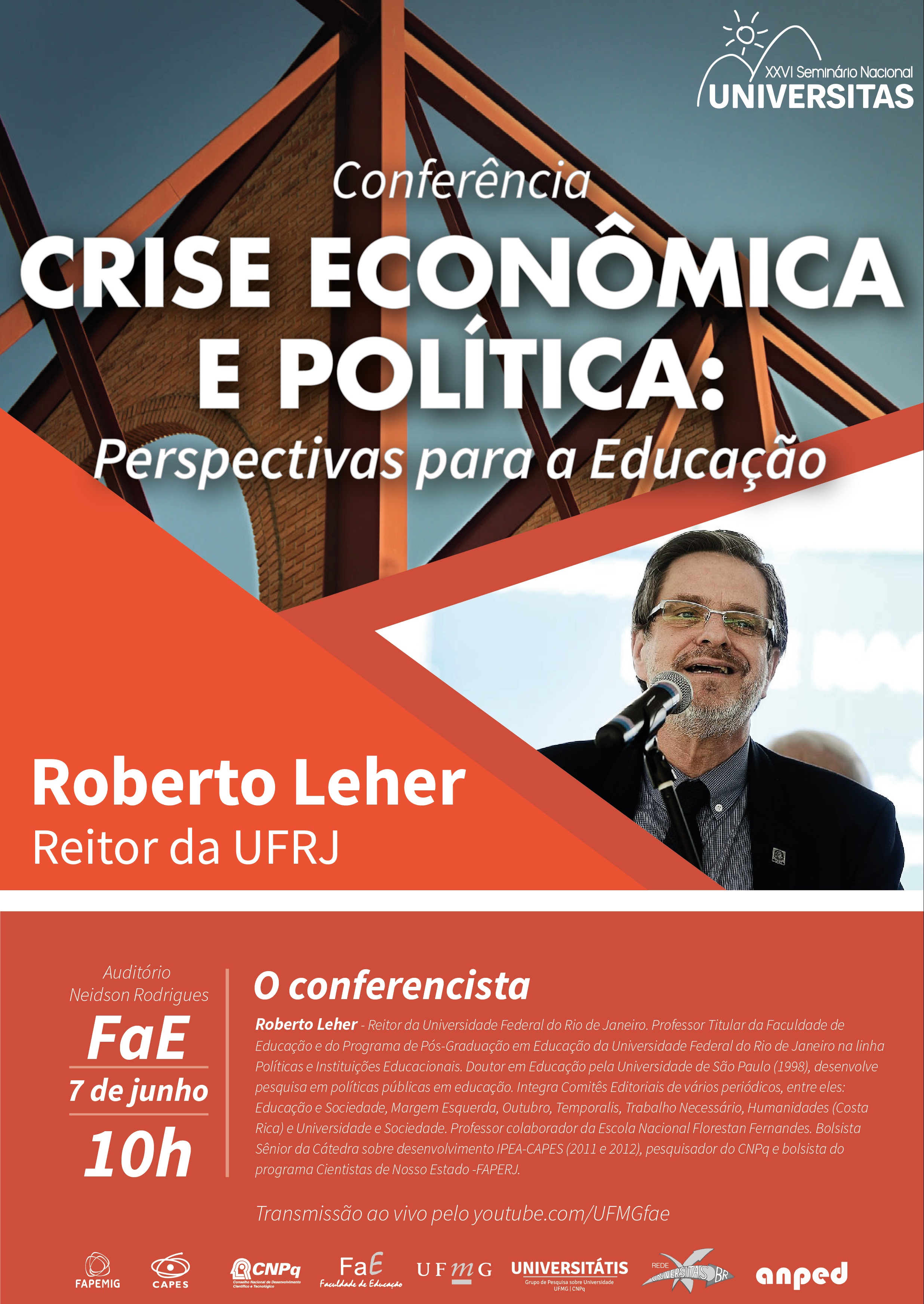 Na quarta-feira, dia 07 de junho , será realizada a Conferência “Crise Econômica e Política: Perspectivas para a Educação” proferida pelo Reitor da Universidade Federal do Rio de Janeiro Prof. Roberto Leher.
